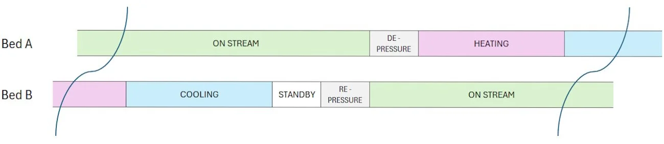 The ‘routing’ valves are shown in positions for Bed A ‘in service’ or ‘Onstream’ adsorbing impurity and Bed B is under thermal regeneration.