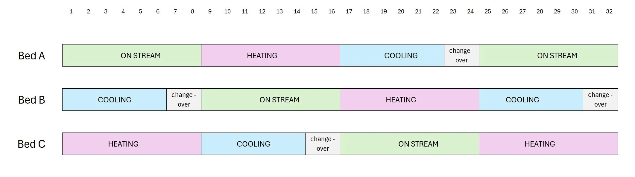 A similar 4-bed arrangement is possible in which at any given time, two beds are simultaneously in service in parallel but staggered by the duration of the heating period.